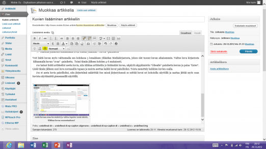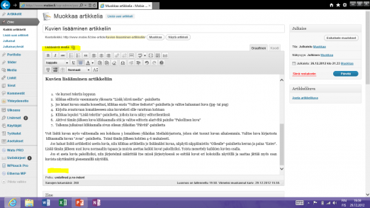 Lisää kuvat normaalisti, mutta nyt tekstiin omalle rivilleen. Tee kuvan ylä- ja alapuolelle tyhjä rivi “Väli kappaleen jälkeen”-painikkeella ja klikkaa kuvaa sekä tämän jälkeen “Ei ensimmäisen rivin sisännystä”-painiketta. Aktivoi lopuksi kuva ja klikkaa alarivin “Palstansisäinen kuva”-painiketta. Tallenna artikkeli normaalisti.