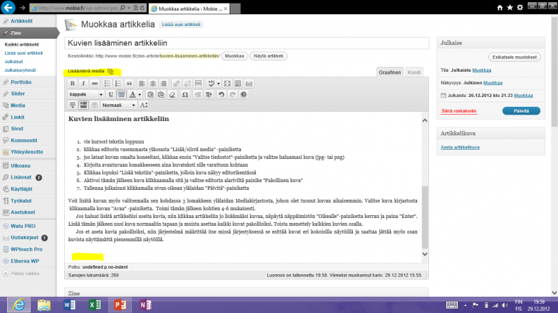 1-2. Siirrä kursori tekstin loppuun ja klikkaa Lisää/siirrä media. Klikkaa kuvaa suurentaaksesi!