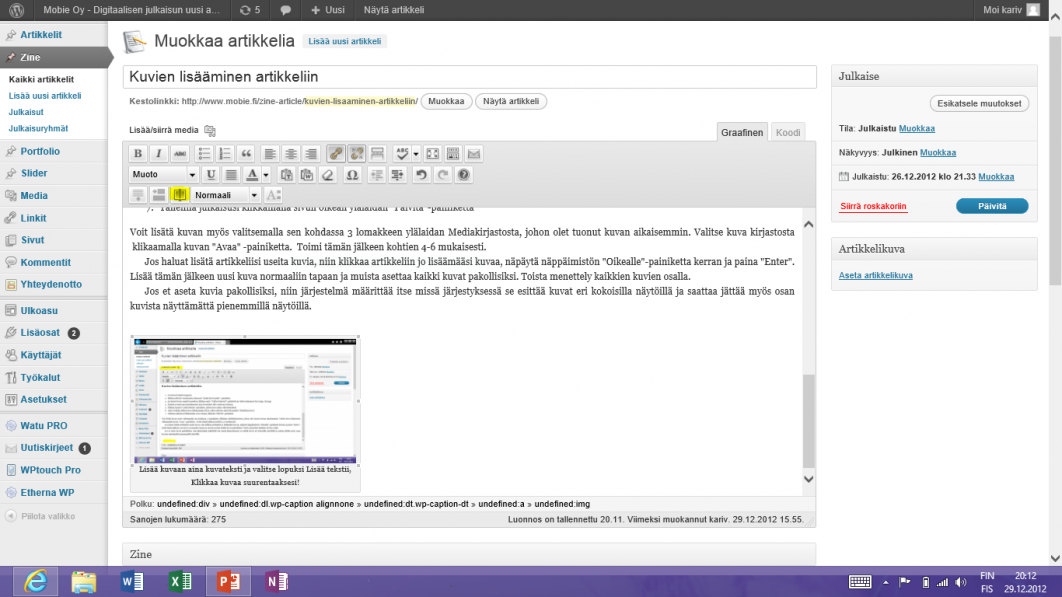 Voit lisätä kuvat myös haluamaasi kohtaan tekstissä (uusi ominaisuus 1/2013). Kuvat näkyvät valmiissa julkaisussa palstan levyisenä halutussa kohdassa tekstiä ja avautuvat normaalisti ruudun kokoisiksi klikattaessa. Katso kuva alla.