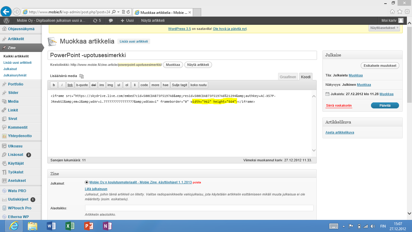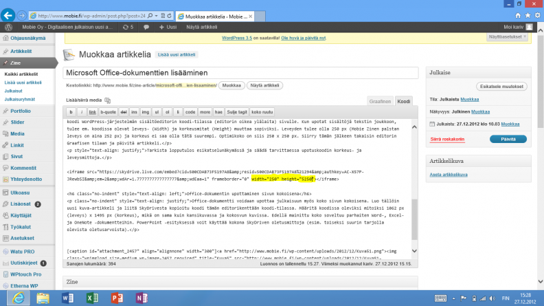 Upota Office-dokumentti haluamaasi kohtaan tekstissä liittämällä edellä mainittu koodi WordPress-järjestelmän sisältöeditorin koodi-tilassa (editorin oikea ylälaita) sivulle. Kun upotat sisältöjä tekstin joukkoon, tulee em. koodissa olevat leveys- (Width) ja korkeusmitat (Height) muuttaa sopiviksi. Leveyden tulee olla 250 px (Mobie Zinen palstan leveys on aina 252 px) ja korkeus ei saa olla tätä suurempi. Optimikoko on siis 250 x 250 px. Siirry tämän jälkeen takaisin editorin Graafisen tilaan ja päivitä artikkeli.