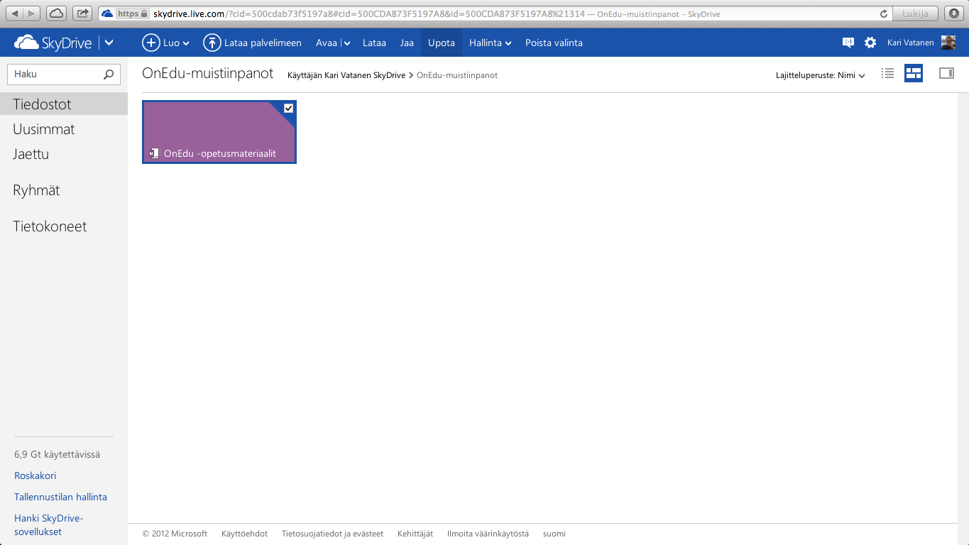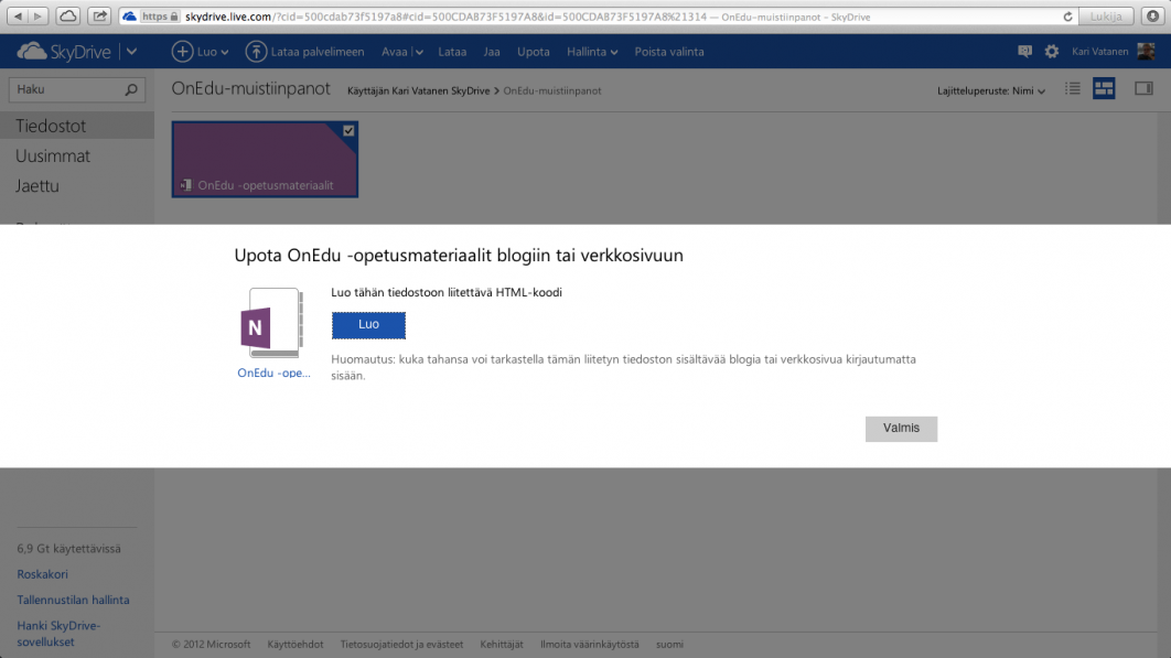 Kuva 1. Valitse haluamasi dokumentti SkyDrivessa ja klikkaa yläpalkista Upota-painiketta. Klikkaa kuvaa suurentaaksesi sen!