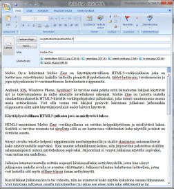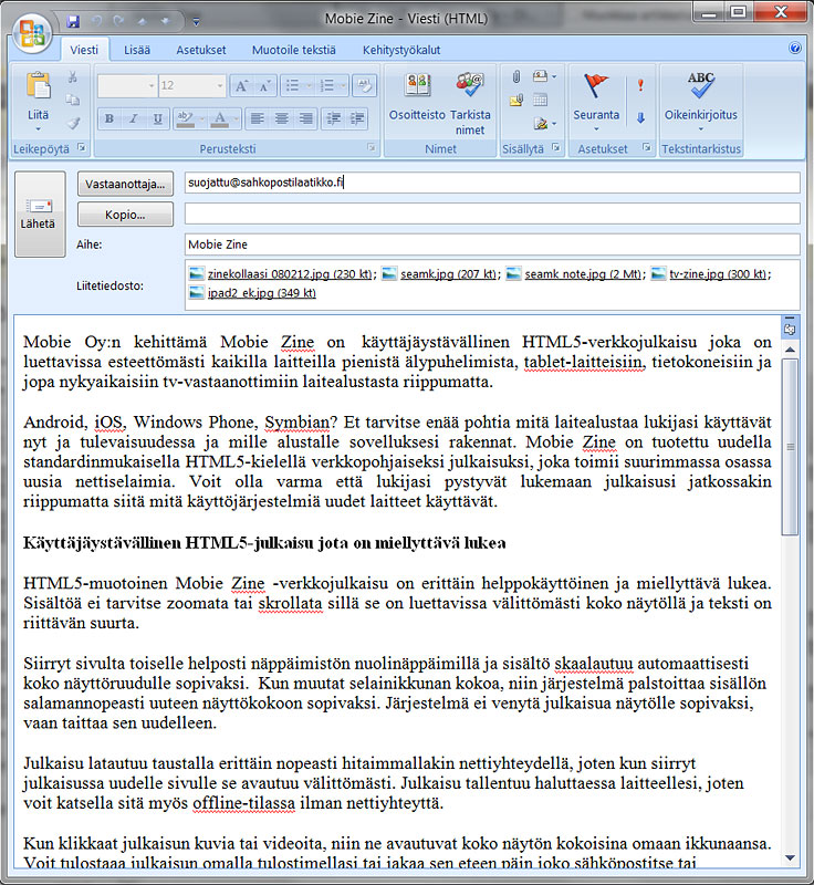 Tekstin lisääminen Mobie Reporteriin sähköpostiviestinä. Klikkaa kuvaa suurentaaksesi!